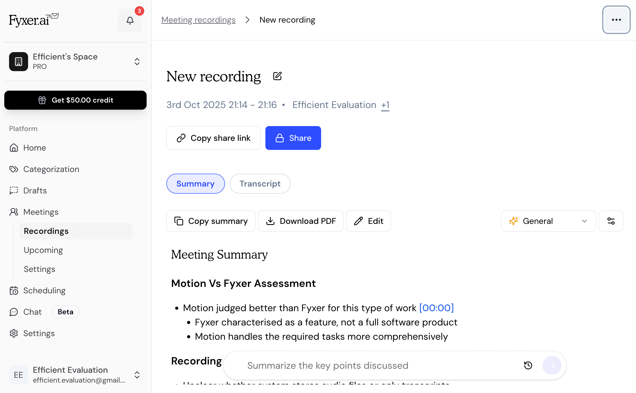 Fyxer also advertises a meeting recording bot that should capture calls and summarizes notes. In testing, it's hit-or-miss. The meeting recorder bot joined the call, but no transcript was created. Maybe the call was too short (15 minutes), or it just doesn't like calls with yourself (which every other AI note taker on the market is totally fine with).