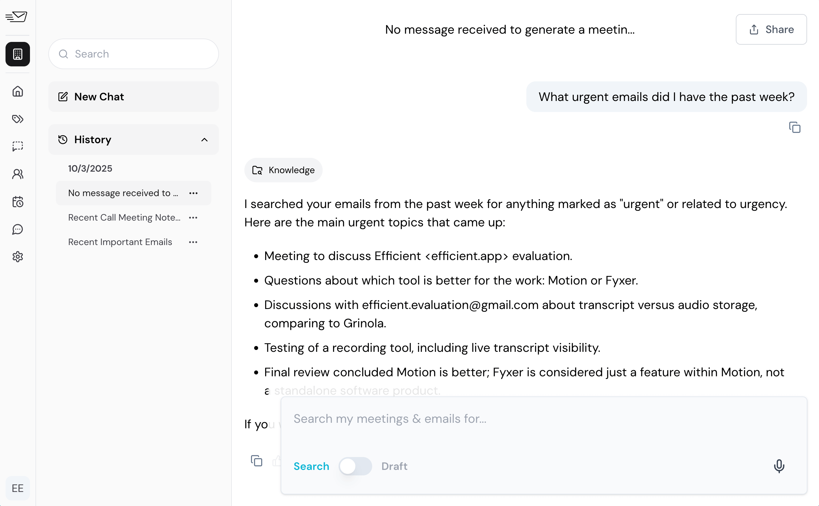 Fyxer has an "AI chatbot", which is probably the most underwhelming AI chatbot of any tool we've covered. It has basic context of your meetings, email, and calendar, but it feels like they're using the most barebones ChatGPT model, and everything I threw at it made me miss ChatGPT and Motion's AI Chatbot.
