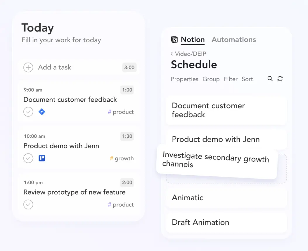 Sunsama on the other hand is more of a daily planner app and personal task management tool that requires you to manually drag tasks to arrange your day based on how you're feeling (not based on AI). You can only plan up-to 2–weeks in advance with Sunsama, so so think of it as more of a short-term focused planning tool, rather than a larger project management tool.