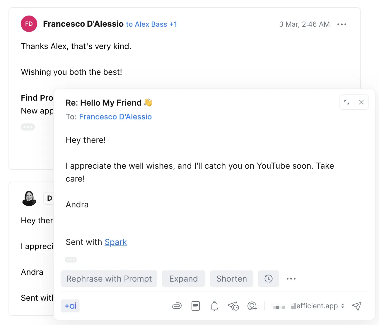 Simply write a prompt and allow Spark + AI to generate a response. You can ask it to change the tone of your email, or shorten/expand it.