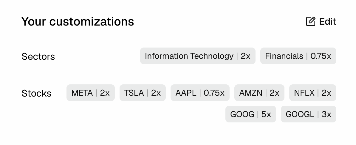 And then layer in customizations (exclude up to two sectors, add/exclude up to 10 stocks) to tilt toward more tech-heavy exposure: